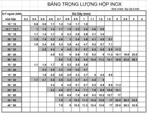 Sau đây là trọng lượng hộp inox phổ biến được tính toán theo khối lượng riêng của từng loại như sau: